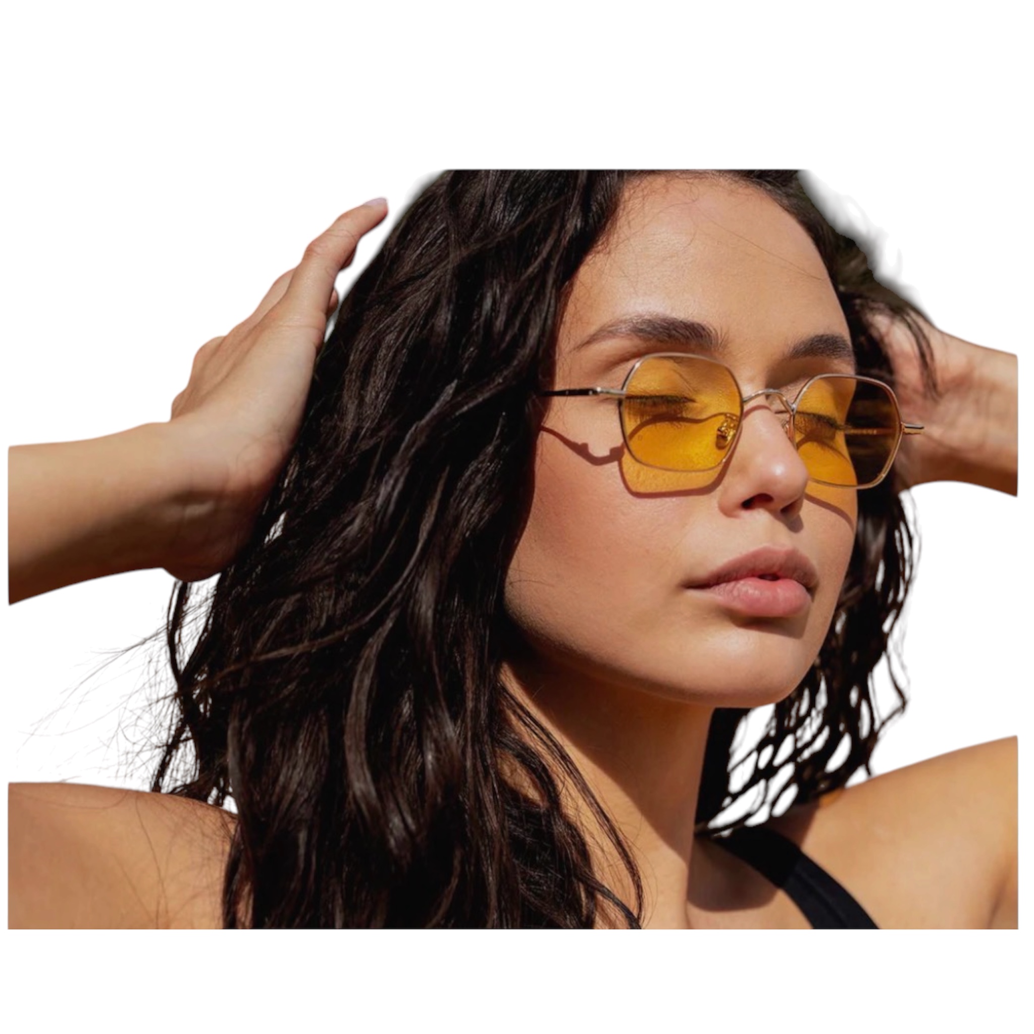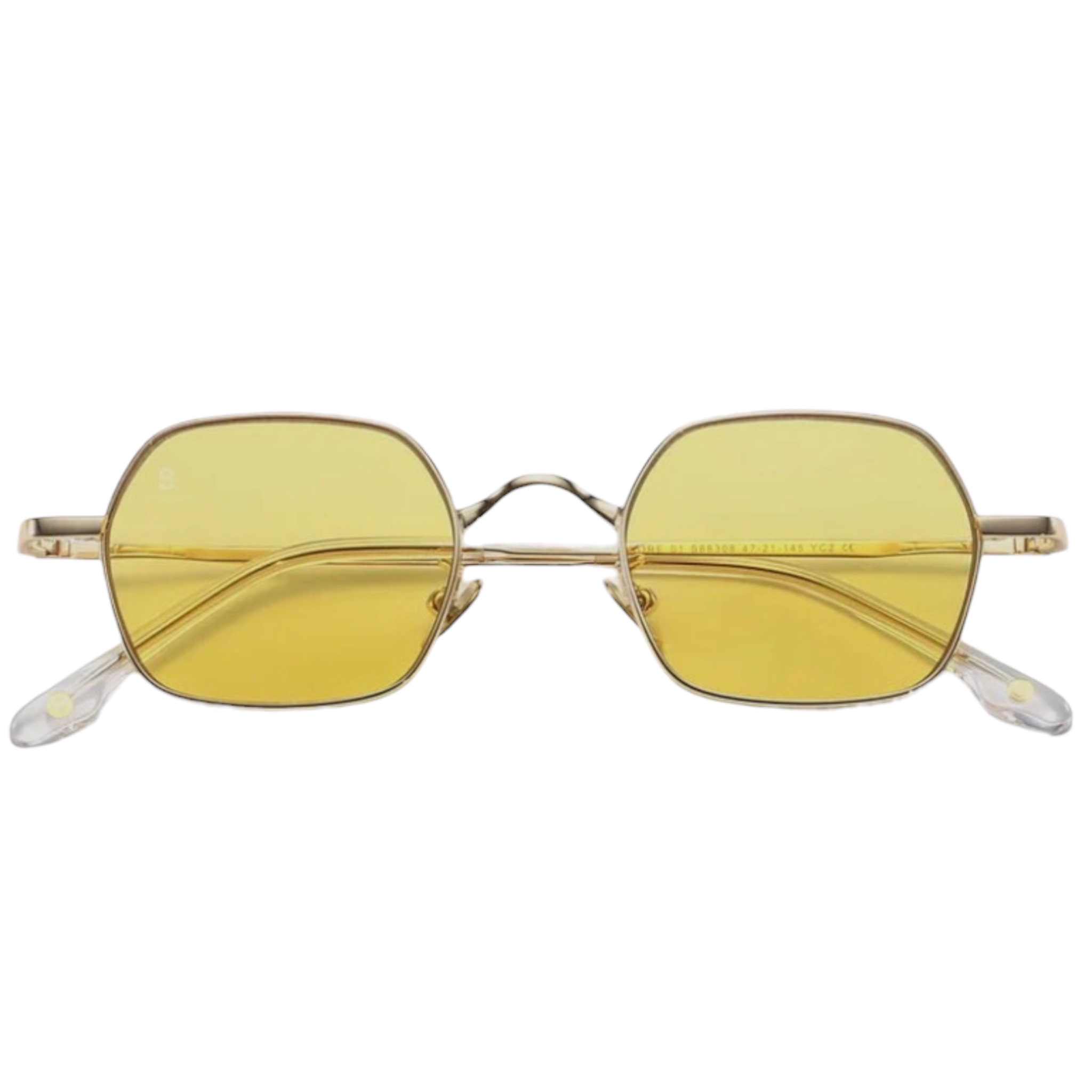 Unisex γυαλιά ηλίου BALI σε πολύγωνο σχήμα. Ο σκελετός είναι μεταλλικός σε χρυσό χρώμα με κίτρινους φακούς που παρέχουν ολοκληρωμένη προστασία από την UV ακτινοβολία.