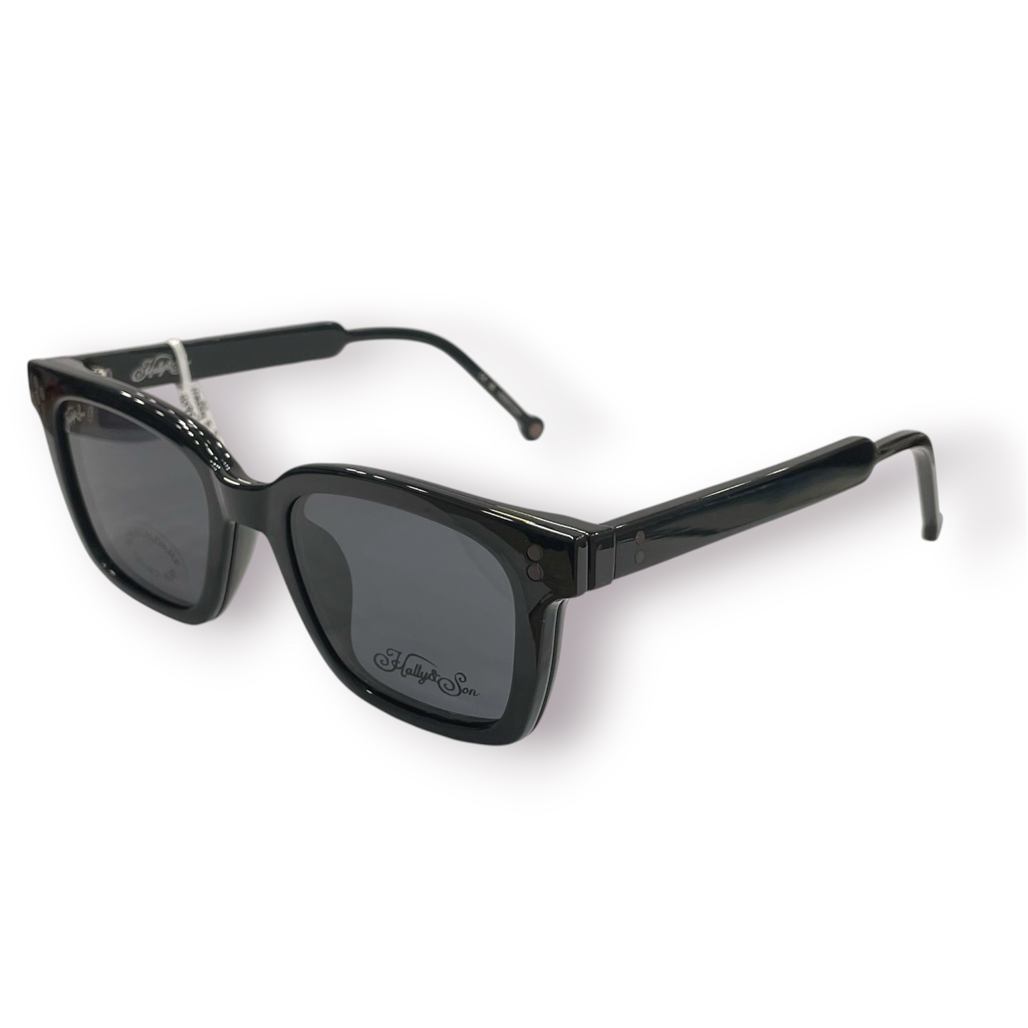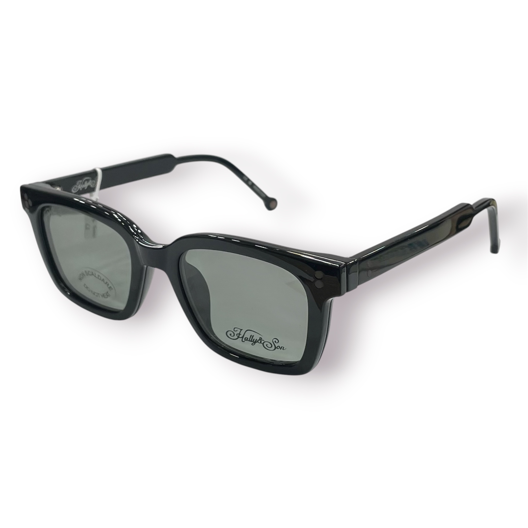 Unisex γυαλιά οράσεως HALLY & SON σε τετράγωνο σχήμα. Ο σκελετός είναι κοκάλινος σε μαύρο χρώμα και διατίθεται με ΔΥΟ Clip-on, στο χρώμα του σκελετού με fume φακούς και με πράσινους φακούς, που παρέχουν ολοκληρωμένη προστασία από την UV ακτινοβολία.