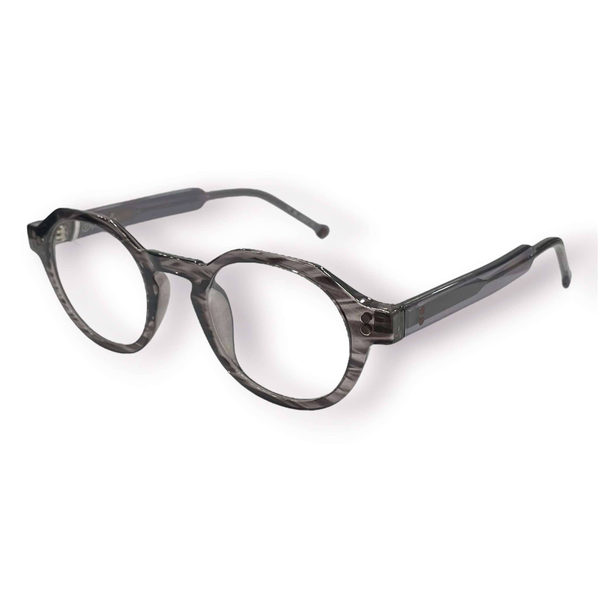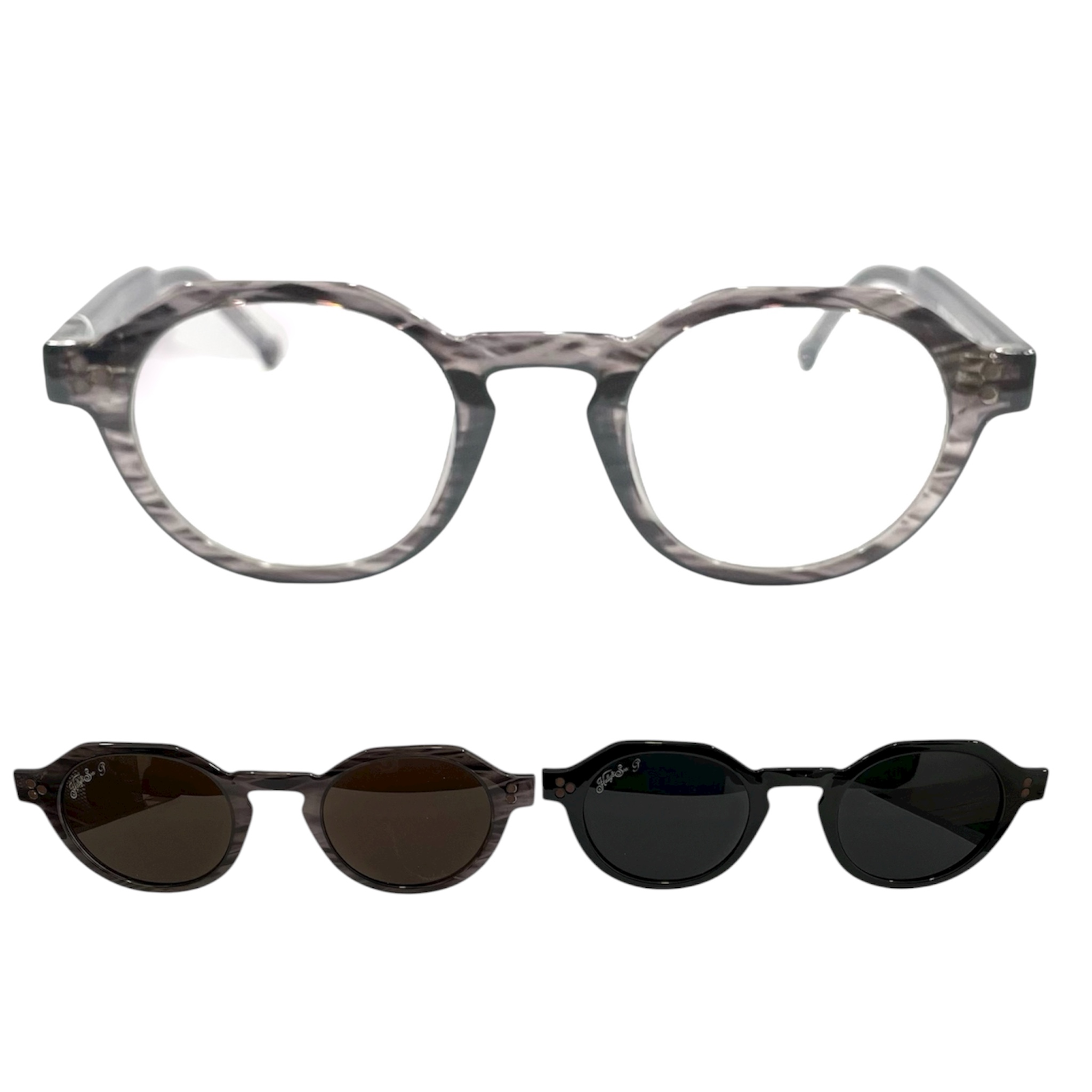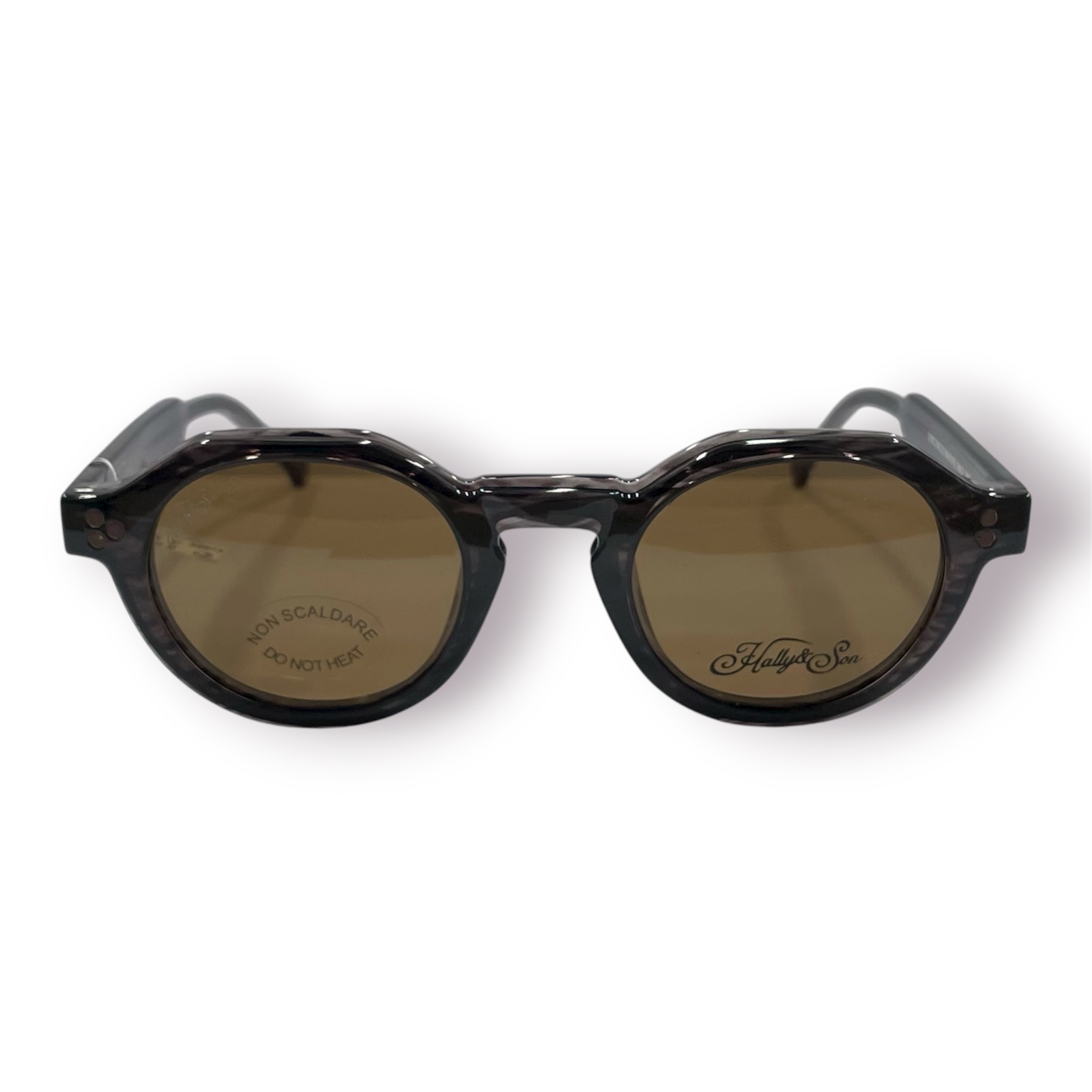 Unisex γυαλιά οράσεως HALLY & SON σε στρογγυλό σχήμα. Ο σκελετός είναι κοκάλινος σε γκρι χρώμα και διατίθεται με ΔΥΟ Clip-on, στο χρώμα του σκελετού με καφέ φακούς και σε μαύρο χρώμα με fume φακούς, που παρέχουν ολοκληρωμένη προστασία από την UV ακτινοβολία.