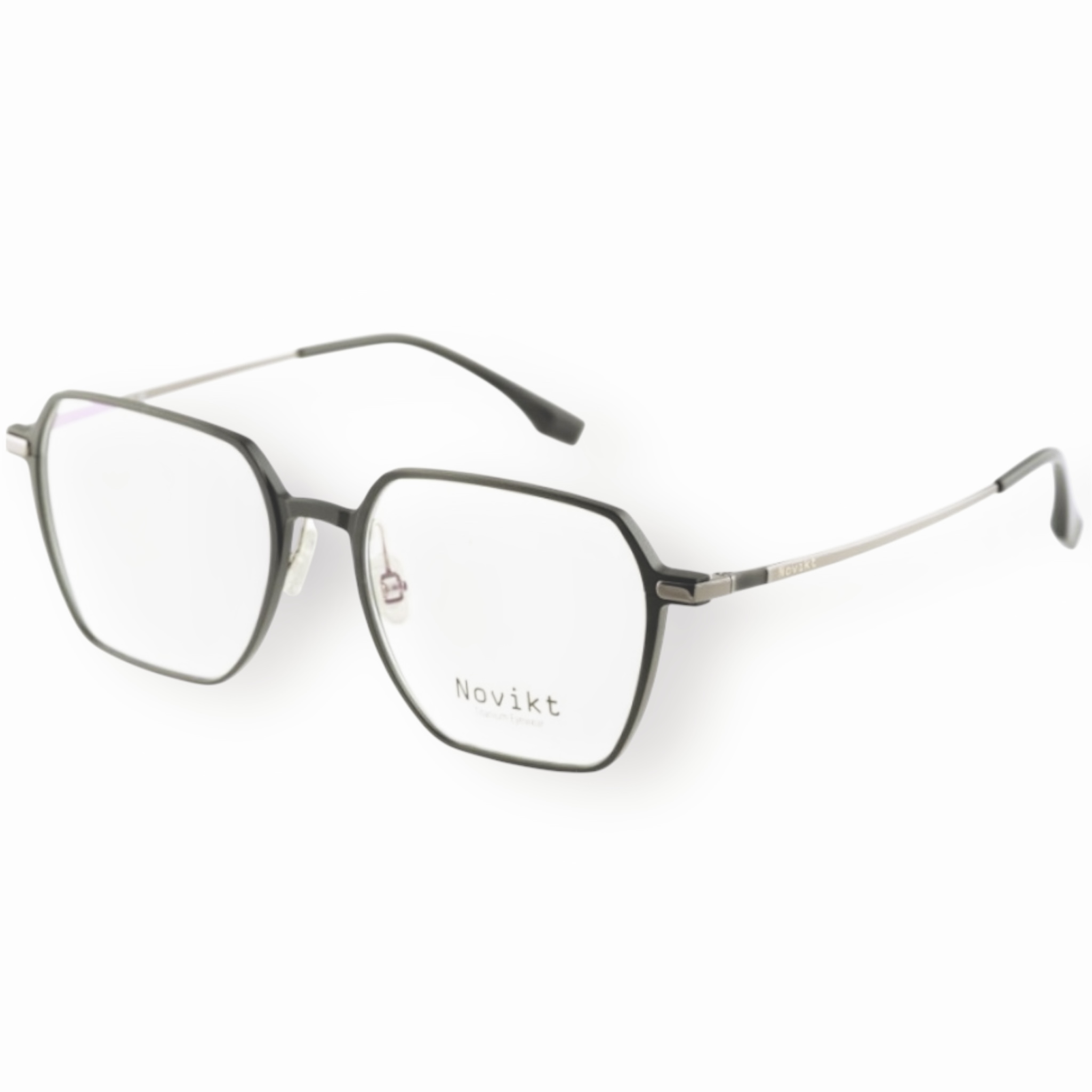 Γυναικεία γυαλιά οράσεως NOVIKT σε τετράγωνο σχήμα. Ο σκελετός είναι μεταλλικός σε γκρι χρώμα με ασημί βραχίονες, ενώ είναι ιδιαίτερα ελαφρύς, λόγω του υλικού κατασκευής του (τιτάνιο).